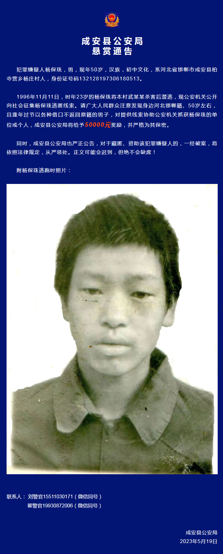 1996年11月11日,时年23岁的杨保珠将本村武某某杀害后潜逃,现公安机关公开向社会征集杨保珠逃匿线索。请广大人民群众注意发现身边河北邯郸籍、50岁左右,且逢年过节以各种借口不返回原籍的男子,对提供线索协助公安机关抓获杨保珠的单位或个人,成安县公安局将给予