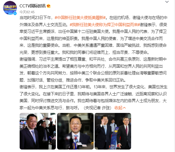 当地时间23日下午,中国新任驻美大使抵美履新。在纽约机场,谢锋大使与在场的中外媒体及各界人士交流互动。我新任驻美大使称为捍卫中国利益而来,谢锋表示,很荣幸受习近平主席委派,出任中国第十二任驻美国大使。我是中国人民的代表,为了捍卫中国利益而来,这是我的神圣职责。我是中国人民的使者,为了增进中美交流合作而来,这是我的重要使命。当前,中美关系遭遇严重困难,面临严峻挑战,我既感到使命光荣,更感到责任重大。我和我的同事们将迎难而上,担当尽责,不辱使命。