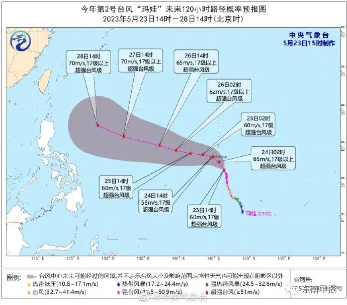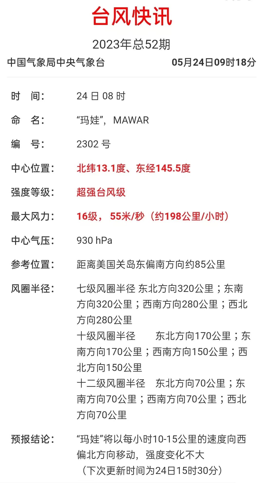 据@中央气象预测,超强台风“玛娃”还在逐渐向西北方向移动, 预计24日白天会以超强台风级(16级或17级以上,55-65米/秒)的强度登陆或掠过美国关岛。可以预见,“玛娃”的破坏力将非同一般,身处关岛或其附近海域的朋友需提前准备,做好防范!