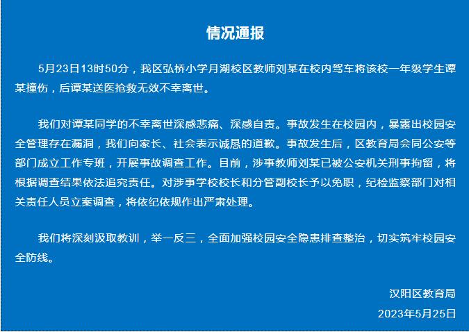 5月23日13时50分,我区弘桥小学月湖校区教师刘某在校内驾车将该校一年级学生谭某撞伤,后谭某送医抢救无效不幸离世。