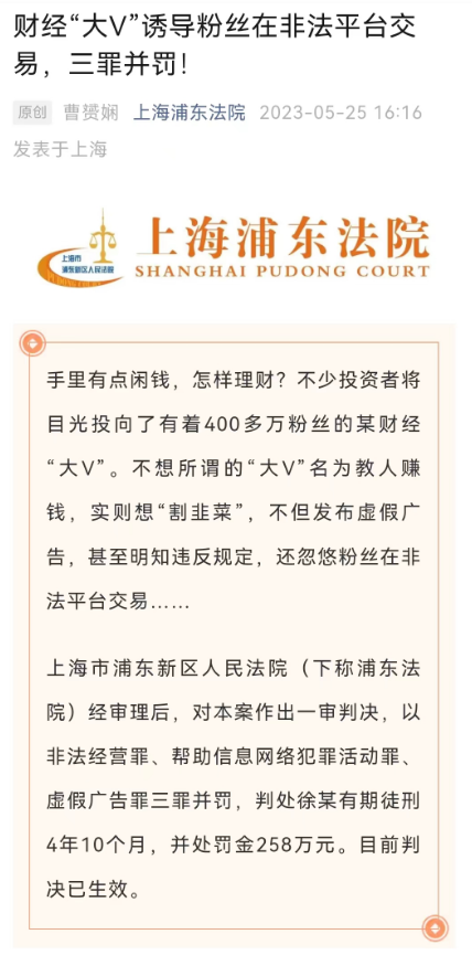 昨天(5月25日),据上海浦东法院官微,上海市浦东新区人民法院经审理后,以非法经营罪、帮助信息网络犯罪活动罪、虚假广告罪三罪并罚,判处徐某有期徒刑4年10个月,并处罚金258万元。 目前判决已生效。