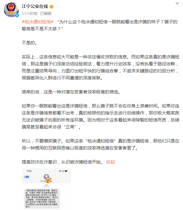 有人会上当受骗@江宁公安在线 则提醒:这条信息较大可能是
