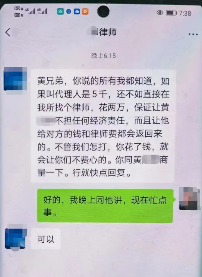 2021年3月,犯罪嫌疑人黄某为了继续骗钱,伪造了自己与某律师事务所律师的微信聊天记录,并对受害人两兄妹说:只要交20000元保证金之后便不用再承担任何经济责任。