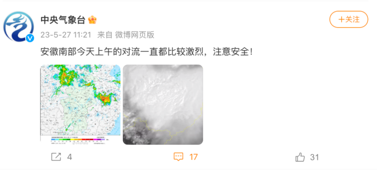 中央气象台午间发布最新提示:安徽南部今天上午的对流一直都比较激烈,注意安全!