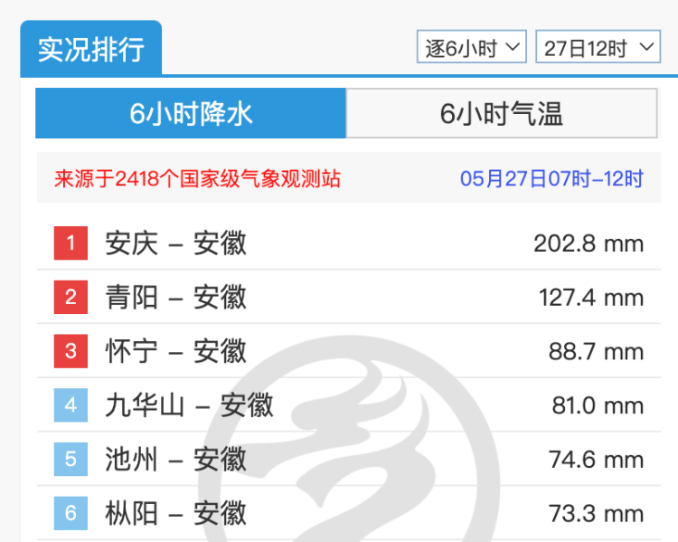 中央气象台逐6小时降水统计显示,安庆、青阳、怀宁、九华山、池州、枞阳位居全国前六。