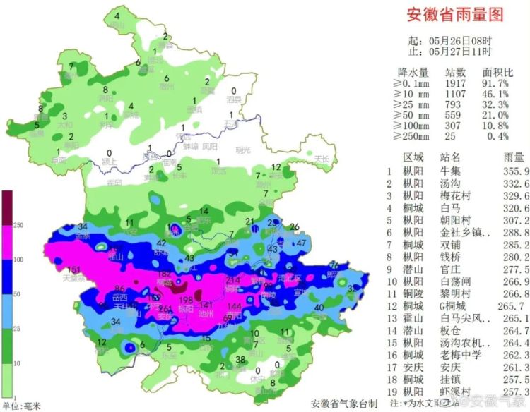 26日08时-27日11时,全省共有559个雨量站降水量超过50毫米,307个雨量站降水量超过100毫米,25个雨量站降水量超过250毫米,最大枞阳牛集355.9毫米。27日08时-11时,阜阳、六安、合肥、滁州、安庆、铜陵、芜湖、马鞍山、池州、宣城、黄山等地有降水,共有64个雨量站降水量超过50毫米,8个雨量站降水量超过100毫米,最大安庆137.8毫米。共有82个站小时最大雨强超过20毫米,26个站小时最大雨强超过40毫米,最大贵池龙山76.9毫米/小时。全省有2个站出现7级以上阵风,最大黄山15米/秒(7级)。