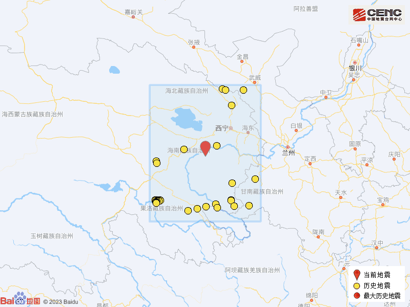 历史地震: 根据中国地震台网速报目录,震中周边200公里内近5年来发生3级以上地震共34次,最大地震是2022年1月12日在青海海北州门源县发生的5.2级地震(距离本次震中208公里),历史地震分布如图。