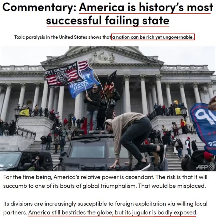 英国《金融时报》此前也曾刊载过该报驻华盛顿首席记者爱德华·卢斯的一篇题为《美国是历史上最成功的失败国家》的文章。