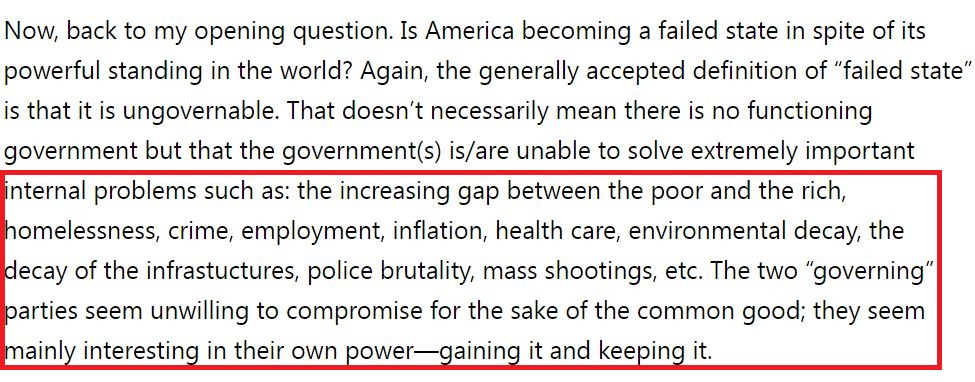 “一个国家可以在很长一段时间内既保持富裕又难以治理。就目前而言,尽管美国的相对实力仍然很强,但它的致命弱点已暴露无遗。”