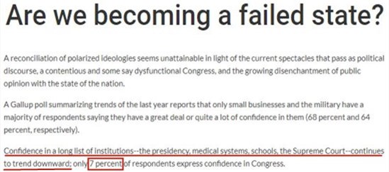 在题为《我们正在成为一个失败国家吗?》的文章中,美国社会学家杰夫·纳什援引的盖洛普民调结果显示,只有7%的受访者表示对美国国会有信心。