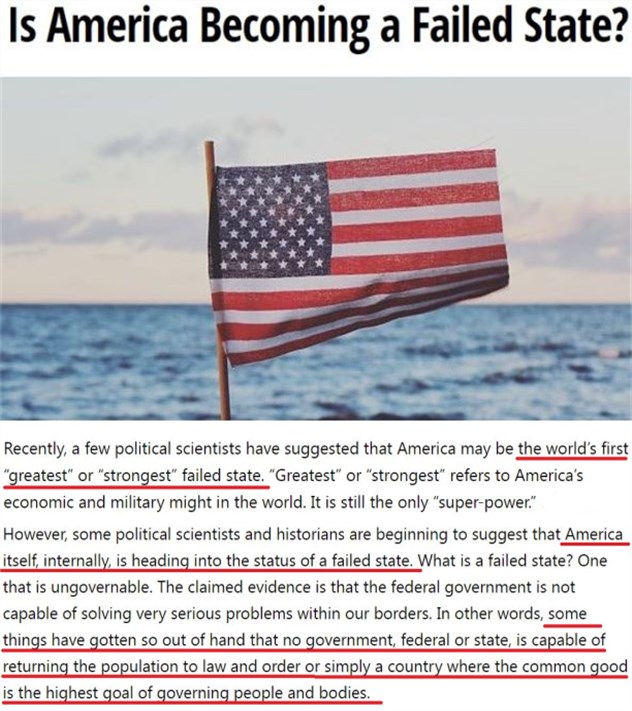 实际上,在很多政治学家看来,美国正在从自身内部演变成为“世界上第一个最伟大或最强大的失败国家”。