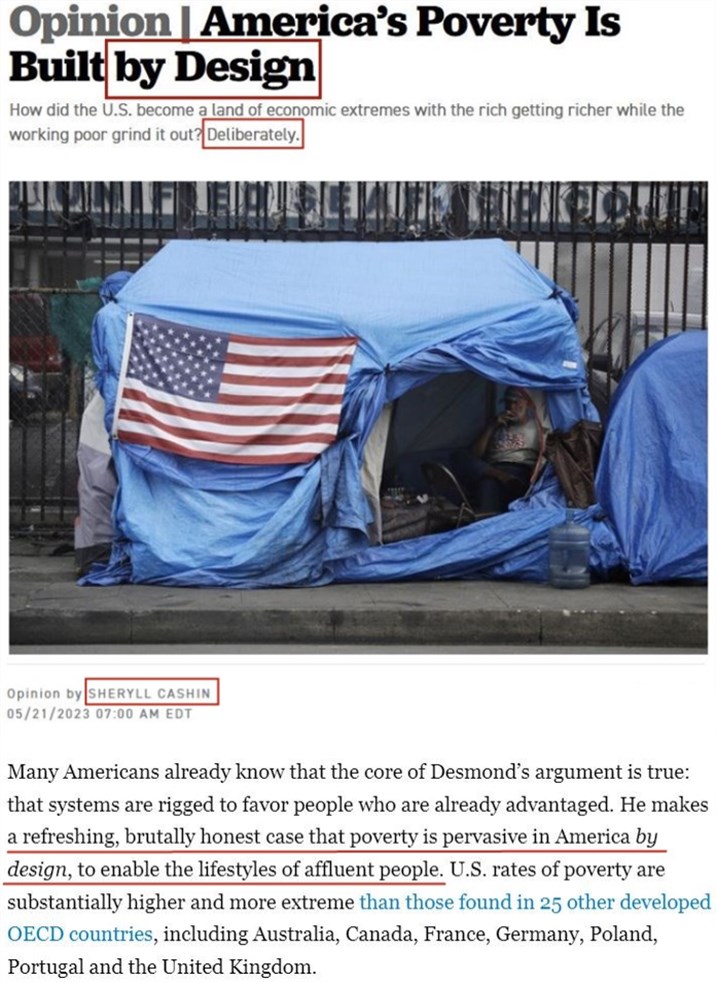 文章称,德斯蒙德提出了一个“残酷而诚实”的观点,即贫困在美国的普遍存在是“有意为之”的,目的是让富人过上更加富裕的生活。