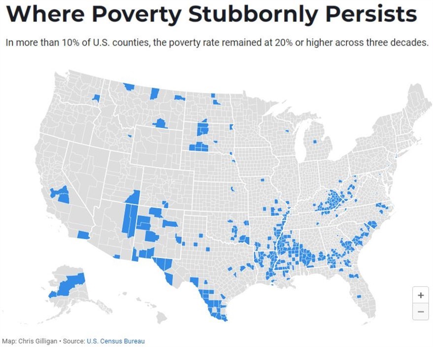 美国人口普查局日前公布的最新数据显示,全美3142个县中有10.9%、即341个县处于“持续贫困”状态。