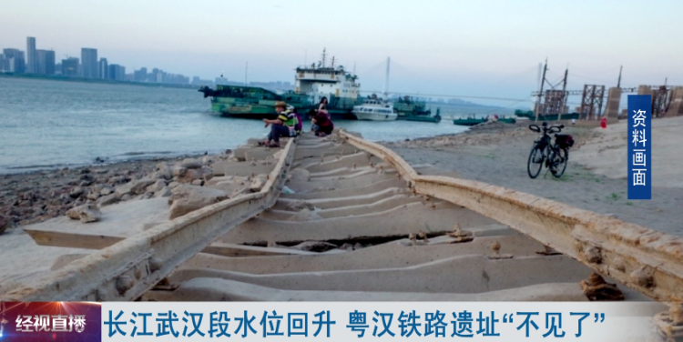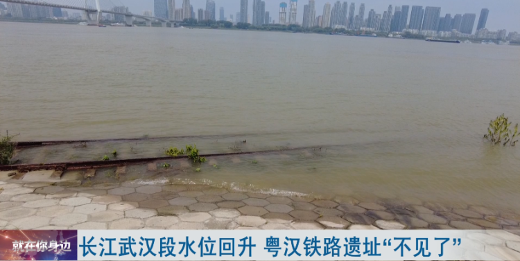 在武汉长江二桥武昌江滩,因为去年水浅裸露出来的粤汉铁路遗址吸引了大批的游客和市民前来打卡留影,但由于近几天水位上涨,铁轨已经几乎被江水掩盖。