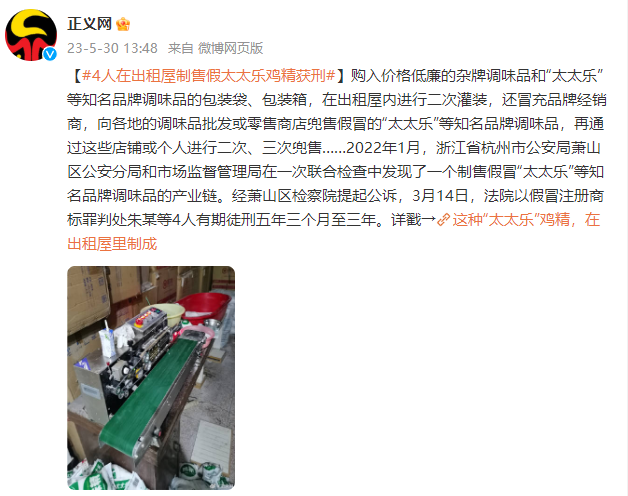 购入价格低廉的杂牌调味品和“太太乐”等知名品牌调味品的包装袋、包装箱,在出租屋内进行二次灌装,还冒充品牌经销商,向各地的调味品批发或零售商店兜售假冒的“太太乐”等知名品牌调味品,再通过这些店铺或个人进行二次、三次兜售……2022年1月,浙江省杭州市公安局萧山区公安分局和市场监督管理局在一次联合检查中发现了一个制售假冒“太太乐”等知名品牌调味品的产业链。经萧山区检察院提起公诉,3月14日,法院以假冒注册商标罪判处朱某等4人有期徒刑五年三个月至三年。