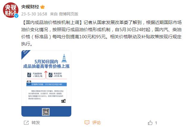 记者从国家发展改革委了解到,根据近期国际市场油价变化情况,按照现行成品油价格形成机制,自5月30日24时起,国内汽、柴油价格(标准品)每吨分别提高100元和95元。相关价格联动及补贴政策按现行规定执行。