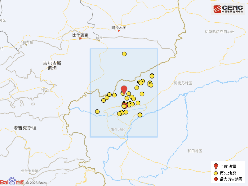 历史地震: 根据中国地震台网速报目录,震中周边200公里内近5年来发生3级以上地震共203次,最大地震是2020年1月19日在新疆喀什地区伽师县发生的6.4级地震(距离本次震中70公里),按震级大小前50次历史地震分布如图。