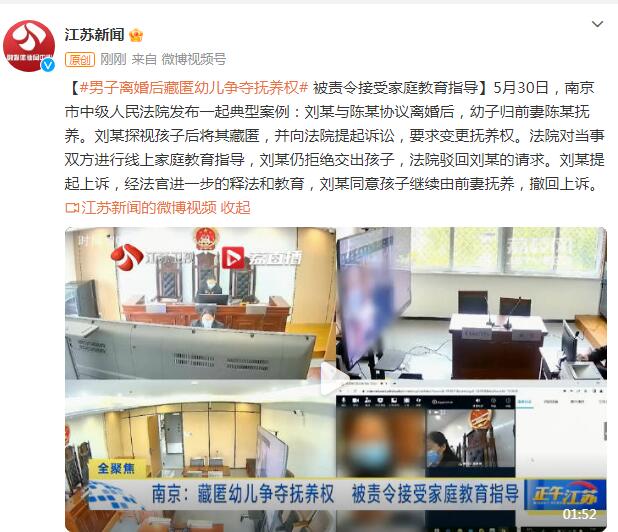 5月30日,南京市中级人民法院发布一起典型案例:刘某与陈某协议离婚后,幼子归前妻陈某抚养。刘某探视孩子后将其藏匿,并向法院提起诉讼,要求变更抚养权。法院对当事双方进行线上家庭教育指导,刘某仍拒绝交出孩子,法院驳回刘某的请求。刘某提起上诉,经法官进一步的释法和教育,刘某同意孩子继续由前妻抚养,撤回上诉。
