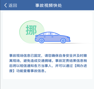 接警人员完成证据固定和信息采集后,"交管12123"APP将推送撤离事故现场提示信息,当事人应当及时撤离,避免交通拥堵。
