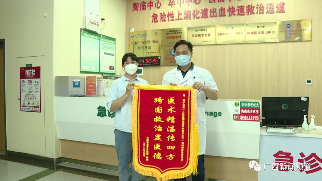 上午,韦先生的母亲张女士把写着“跨国救治显医德”的锦旗送到了南宁市第一人民医院急诊科。她告诉记者,4月23日晚上,在越南工作的儿子突然被蛇咬了。