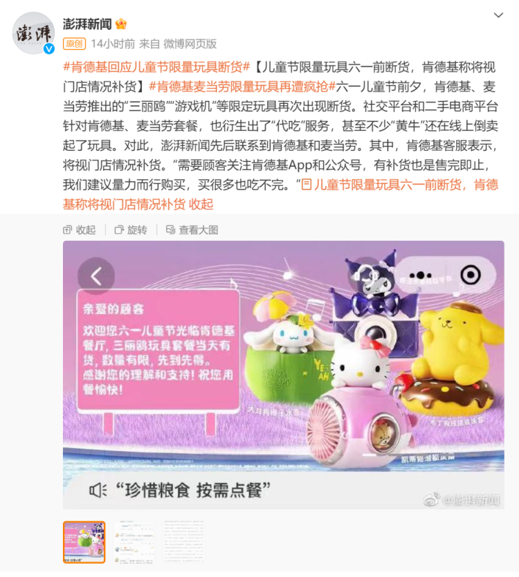 儿童节前夕,肯德基、麦当劳推出的“三丽鸥”“游戏机”等限定玩具再次出现断货。