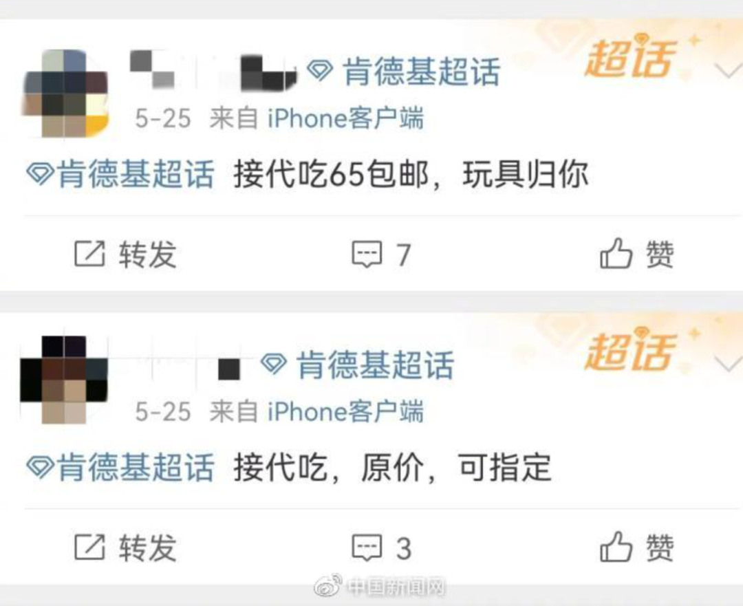 社交平台和二手电商平台针对肯德基、麦当劳套餐,衍生出了“代吃”服务,甚至不少“黄牛”还在线上倒卖起了玩具。