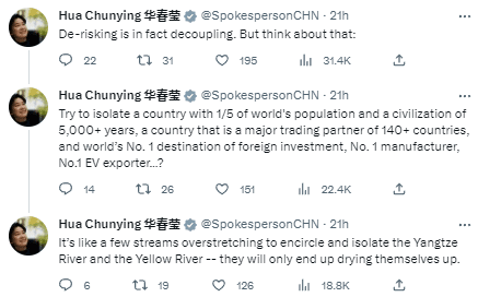 “‘去风险’实际上就是脱钩。但是仔细想想,”华春莹发推写道,“试图孤立一个拥有世界1/5人口和5000多年文明的国家,这个140多个国家(和地区)的主要贸易伙伴、全球第一大外国投资目的地(国)、制造业第一大国、全球第一大电动汽车出口国……”