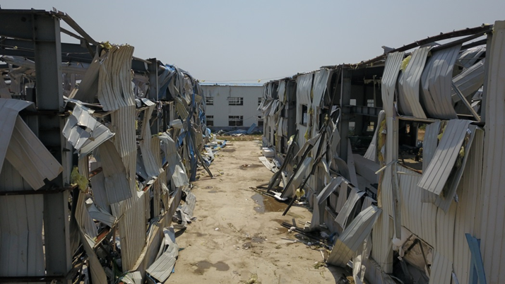 最终,专家们通过沿着龙卷风移动路径进行现场调查,在工业园区中部发现一座钢筋混凝土框架结构的二层楼被夷为平地,判定龙卷风在此处达到最强,确定其强度为中国龙卷风强度等级四级(相当于EF4级)。