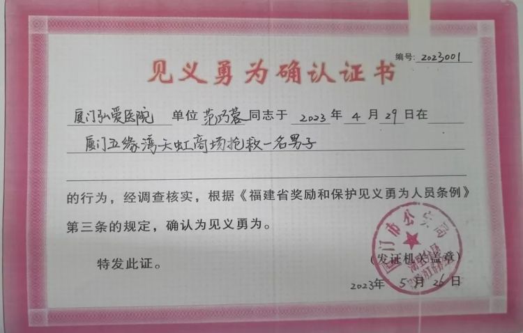 4月29日,厦门弘爱医院肝病科护士范巧蓉下班后在五缘湾天虹商场购物时,遇到一名突发疾病倒地的男子。
