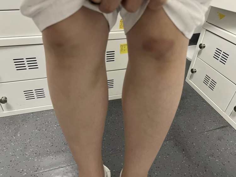 救人一周后,范巧蓉的膝盖仍是青紫的