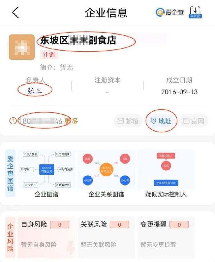 第一步:多种途径寻找受害人。 诈骗分子通过爱企查、百度地图、美团等网络途径,获取受害人身份信息、经营信息、联系电话及位置等信息。