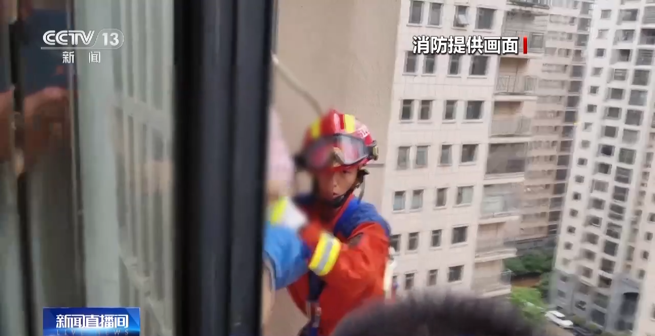 消防员接警后很快到场,并立即穿戴好高空作业防护装备展开救援。根据现场情况,一名消防救援人员从14楼卧室窗口处探出身体,为男孩系上安全腰带,在给孩子做好保护措施后,消防员用双手将男孩慢慢转移至房间窗户。在多名消防员的协助下,男孩被救进室内。