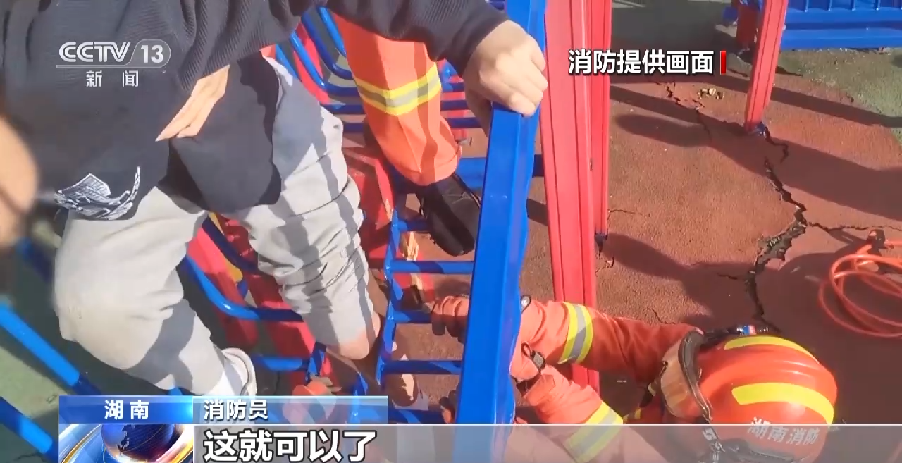 近日,湖南株洲一名8岁男童在室外公共游乐设施玩耍时,一脚踩进了攀爬架的缝隙里被卡。消防员到场后看到,男孩左腿悬空卡在攀爬架的栏杆中,无法动弹。消防员一边安慰孩子的情绪,一边使用液压剪切钳,将攀爬架的前后两端剪开。