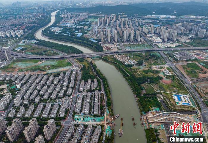 6月3日,航拍南京梅苑南路跨秦淮新河大桥施工现场。近日,南京梅苑南路跨秦淮新河大桥建设有序推进,大桥主体结构已经全部吊装完成,目前,施工方中建三局的建设者正在进行箱梁焊接、顶推设备调试和临时支墩的安装。梅苑南路跨秦淮新河大桥建设工程项目位于南京市雨花台区,路线总长约850米,建成通车后将进一步改善区域交通环境,为市民出行提供便利。