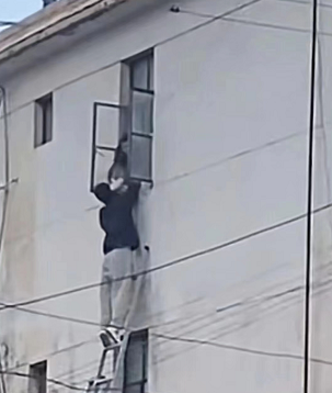 陈玉周爬上梯子将被困母子安全救下