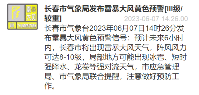 预计未来6小时内,长春市将出现雷暴大风天气,阵风风力可达8~10级,局部地方可能出现冰雹、短时强降水、龙卷等强对流天气, 市应急管理局、市气象局联合提醒,注意做好预防工作。
