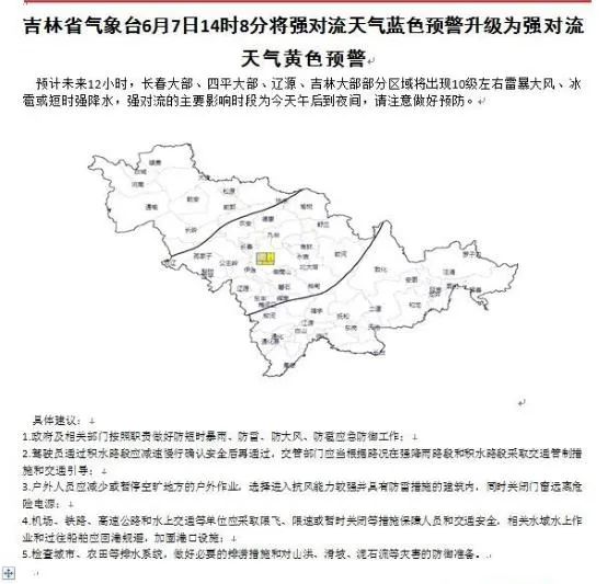 预计未来12小时,长春大部、 四平大部、辽源、吉林大部部分区域将出现10级左右雷暴大风、冰雹或短时强降水, 强对流的主要影响时段为今天午后到夜间,请注意做好预防。