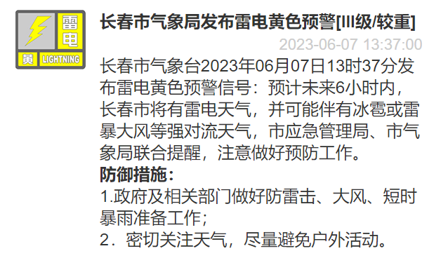预计未来6小时内,长春市将有雷电天气,并可能伴有冰雹或雷暴大风等强对流天气, 市应急管理局、市气象局联合提醒,注意做好预防工作。