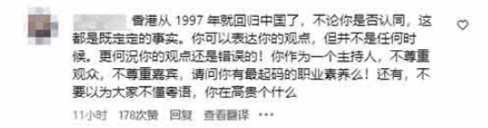 还有网友称,你可以表达你的观点,但并不是任何时候,更何况你的观点还是错误的!你作为一个主持人,不尊重观众,不尊重嘉宾,请问你有最起码的职业素养吗?还有,不要以为大家不懂粤语,你在高贵个什么?