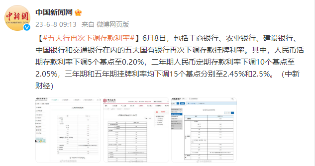 6月8日,包括工商银行、农业银行、建设银行、中国银行和交通银行在内的五大国有银行再次下调存款挂牌利率。其中,人民币活期存款利率下调5个基点至0.20%,二年期人民币定期存款利率下调10个基点至2.05%,三年期和五年期挂牌利率均下调15个基点分别至2.45%和2.5%。(中新财经)