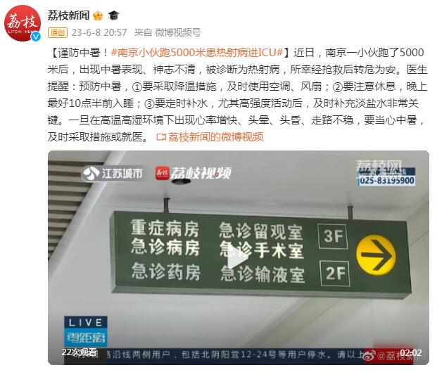 近日,南京一小伙跑了5000米后,出现中暑表现、神志不清,被诊断为热射病,所幸经抢救后转危为安。医生提醒:预防中暑,①要采取降温措施,及时使用空调、风扇;②要注意休息,晚上最好10点半前入睡;③要定时补水,尤其高强度活动后,及时补充淡盐水非常关键。一旦在高温高湿环境下出现心率增快、头晕、头昏、走路不稳,要当心中暑,及时采取措施或就医。