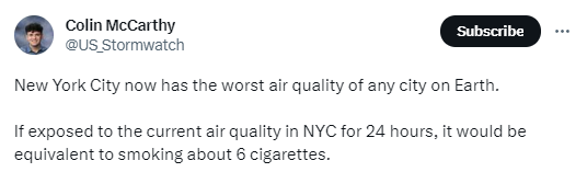 《纽约时报》指出:“加拿大山火所产生的烟霾在7日笼罩了纽约市的天空,使得空气质量指数飙升至400以上,完全进入‘危险’范围。这是自美国国家环境保护局1999年开始记录以来,纽约空气质量监测数据的最差水平。”