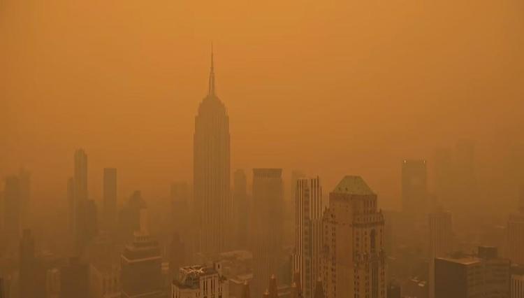 由于加拿大多地森林山火产生的大量烟霾南移,纽约市空气7日出现严重污染。当天下午2点左右,纽约市完全被暗黄色烟霾笼罩,空气里明显的烟味令人不适,各幢地标性建筑仿佛烟雾缭绕之中的海市蜃楼。