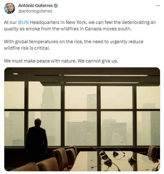 联合国秘书长安东尼奥·古特雷斯也在社交媒体上为控制山火疾呼:“在纽约的联合国总部,我们可以感受到随着加拿大山火产生的烟霾南移,空气质量不断恶化。随着全球气温的上升,减少山火风险的需求非常迫切。我们必须与自然和平相处。我们不能放弃。”