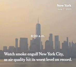 当地时间6月6日,烟霾已笼罩了美国东北海岸的天空。6月7日,美国纽约市空气出现严重污染。当天,《纽约时报》在其社交媒体上发布了一支延时视频,展现了纽约天空在一日内从雾霾灰不断加深的整个过程,城市在下午2点完全被暗黄色烟霾笼罩。