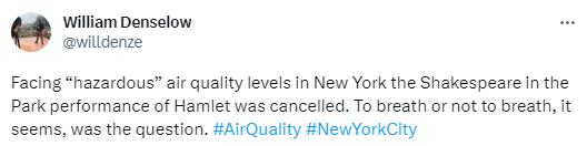 “面对纽约‘危险’的空气质量水平,‘莎士比亚在公园’的《哈姆雷特》演出被取消。呼吸还是不呼吸,似乎是一个问题。”