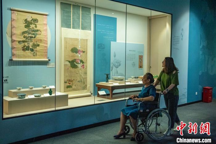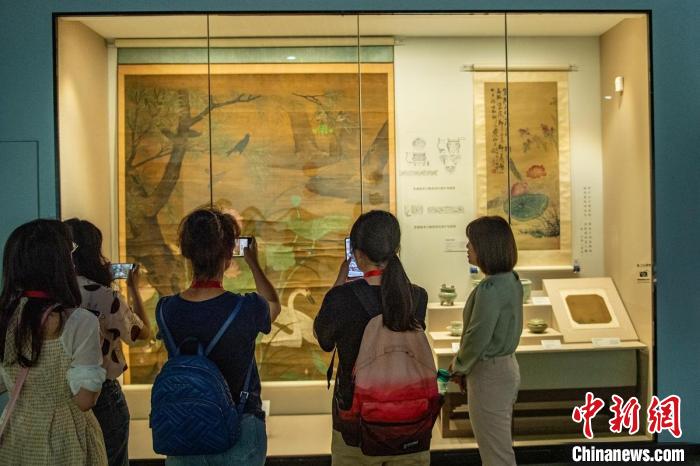 与荷有关的绢帛、书画等文物展品吸引参观者拍照。 刘忠俊 摄
