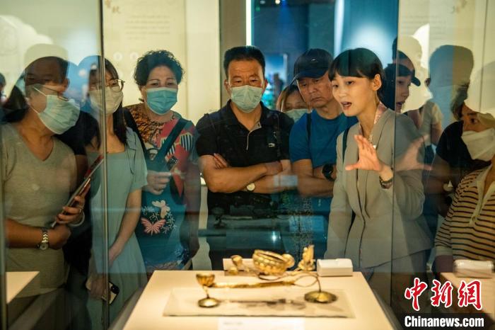 讲解员向参观者介绍宋代银质鎏金莲花宝子香炉展品。 刘忠俊 摄