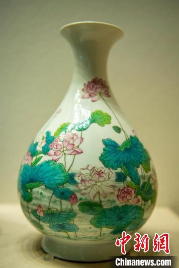 现场展出的粉彩荷莲纹玉壶春瓶(清代)。 刘忠俊 摄