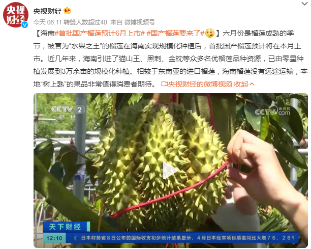 六月份是榴莲成熟的季节,被誉为“水果之王”的榴莲在海南实现规模化种植后,首批国产榴莲预计将在本月上市。近几年来,海南引进了猫山王、黑刺、金枕等众多名优榴莲品种资源,已由零星种植发展到3万余亩的规模化种植。相较于东南亚的进口榴莲,海南榴莲没有远途运输,本地“树上熟”的果品非常值得消费者期待。
